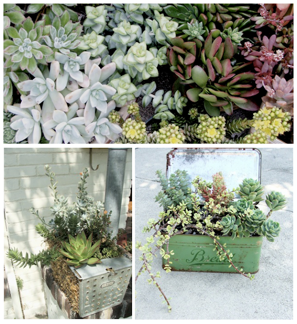 Something that I hope to acquire someday is my mother's green thumb. She reminds me of the pie-maker in Pushing Daisies who magically brings dying plants to life and even makes them thrive. One of her (and my) favorite plants is the adorable succulent...she grows huge planters of them, while I admire from afar (for now). Here are some photos I came across while browsing wedding planner and home blogs...a past-time I never get tired of. I love the plump rosette forms (particularly the 'Echeveria' variety) and the subdued color palettes...perfect for summer weddings. On top of everything, they can be a green alternative to cut flowers since they are potted and will last for a very long time! They look beautiful used alone: